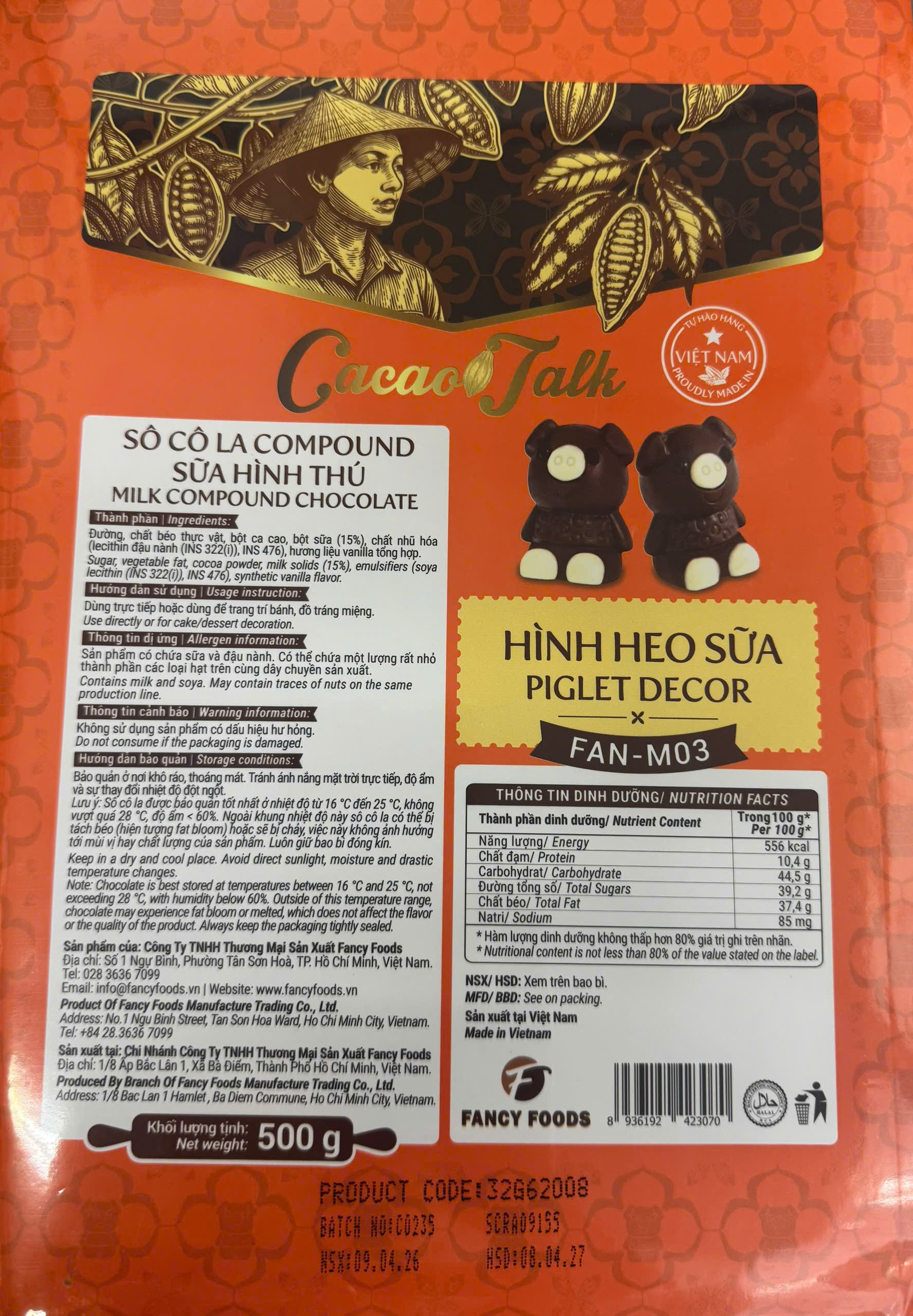 Sô Cô La Compound Hình Heo Sữa Fan-M03(500gr) là sản phẩm của công ty TNHH Thương Mại Sản Xuất Fancy Foods. Một thương hiệu chuyên sản xuất các dòng sản phẩm từ sô cô la tại Việt Nam. Điểm nổi bật của các sản phẩm chính là, mang đến một trải nghiệm về hương vị sô cô la hảo hạng thông qua quy trình sản xuất, kiểm soát nghiêm ngặt, từ khâu nguyên liệu đầu vào đến thành phẩm đầu ra. Với các sản phẩm đặc biệt như: Sô Cô La Bọc Hạt, Sô Cô La Nút Nguyên Chất, Sô cô la compound,… Thích hợp dùng cho làm bánh, pha chế thức uống và trang trí.